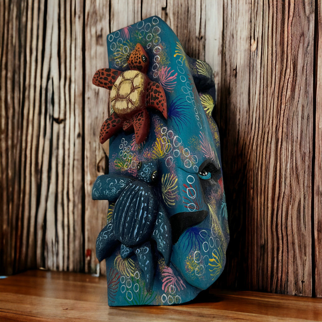 Diese Maske zeigt zwei Meeresschildkröten, die durch ein farbenreiches Korallenriff gleiten – Sinnbilder für Langlebigkeit, Schutz und die tiefe Weisheit des Ozeans.