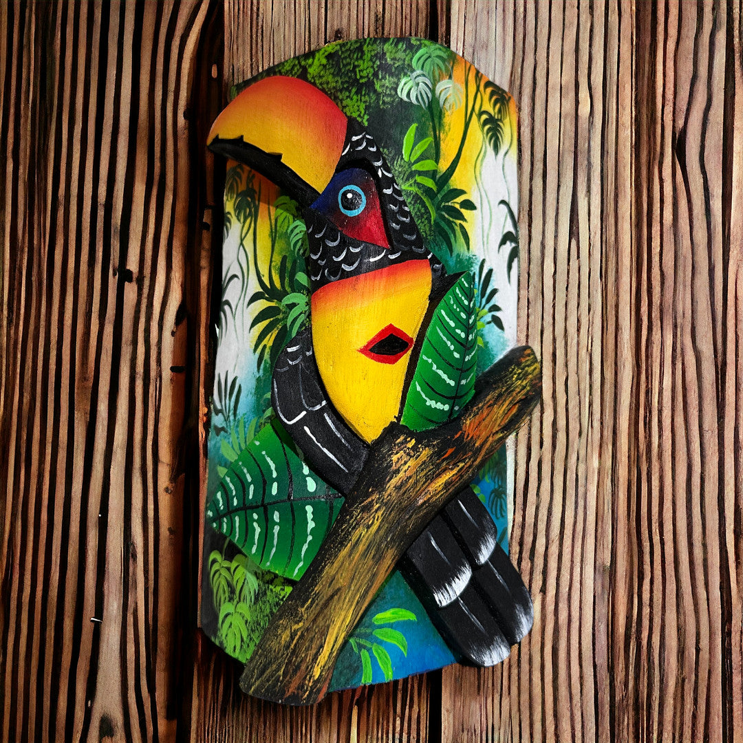 Diese Maske zeigt einen farbenprächtigen Tukan, der auf einem verwitterten Ast im dichten Regenwald sitzt.