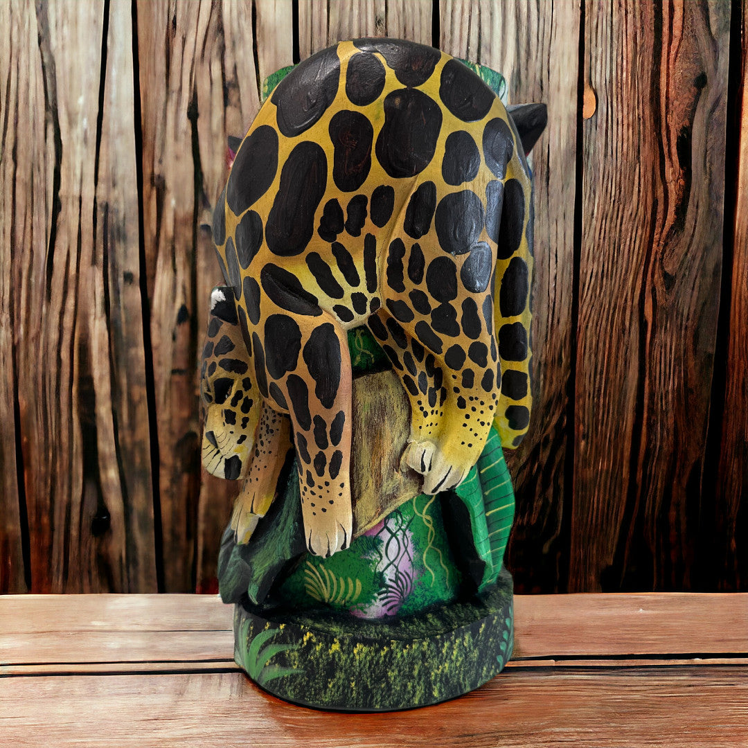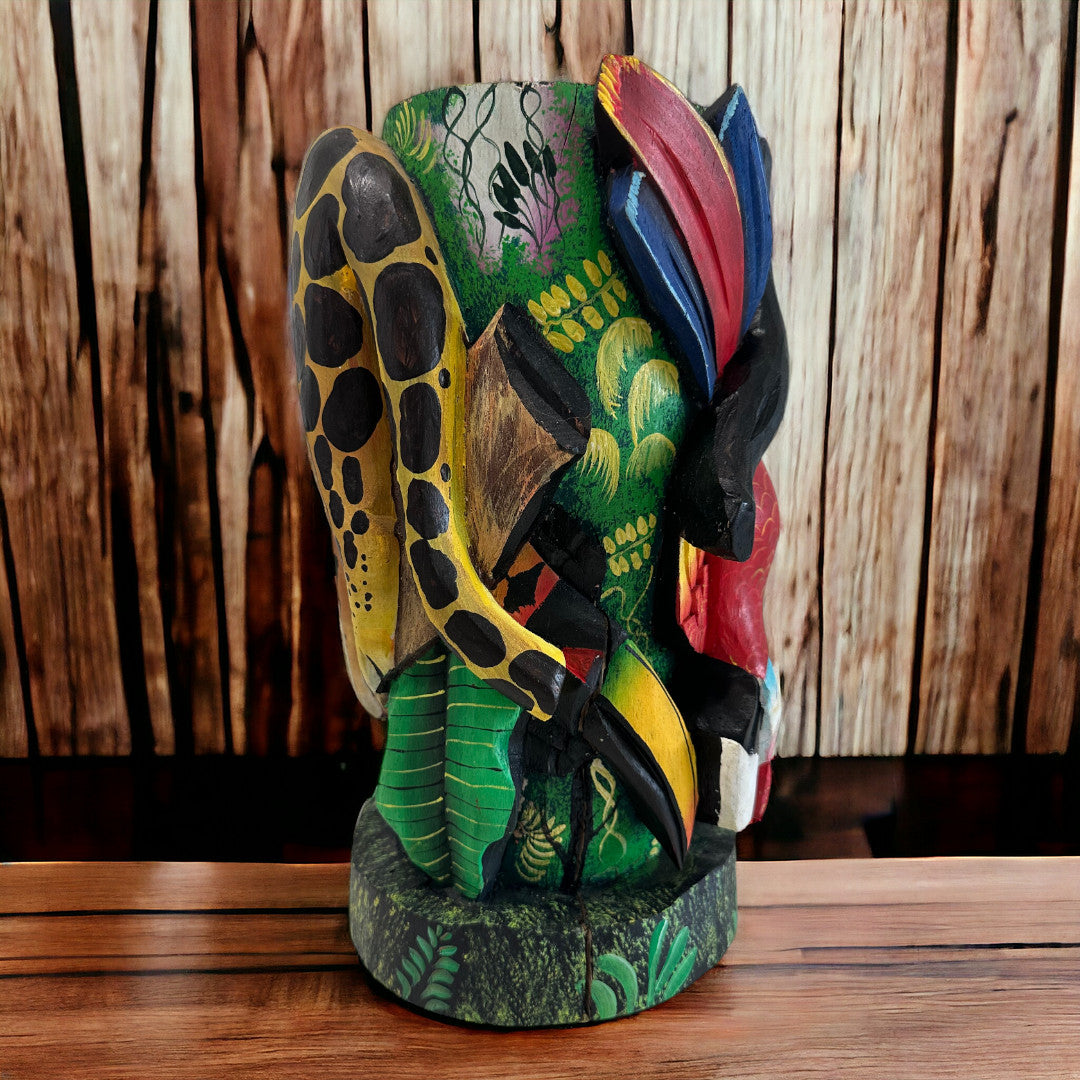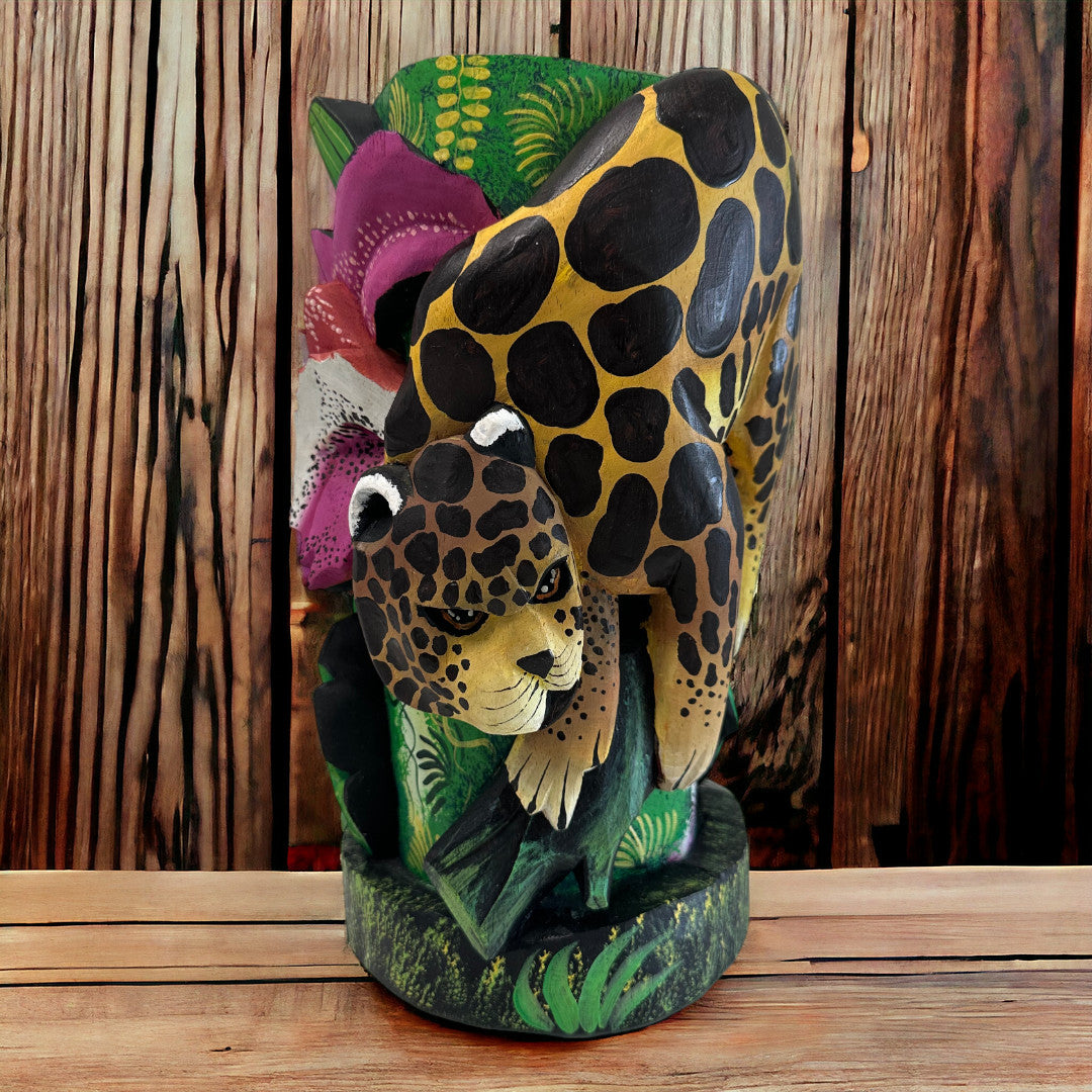 Diese aufwendig geschnitzte Skulpturenmaske zeigt den Jaguar, das kraftvollste Wesen des mittelamerikanischen Dschungels, eingebettet in eine lebendige Szene aus tropischen Pflanzen, Blüten und exotischen Tieren.