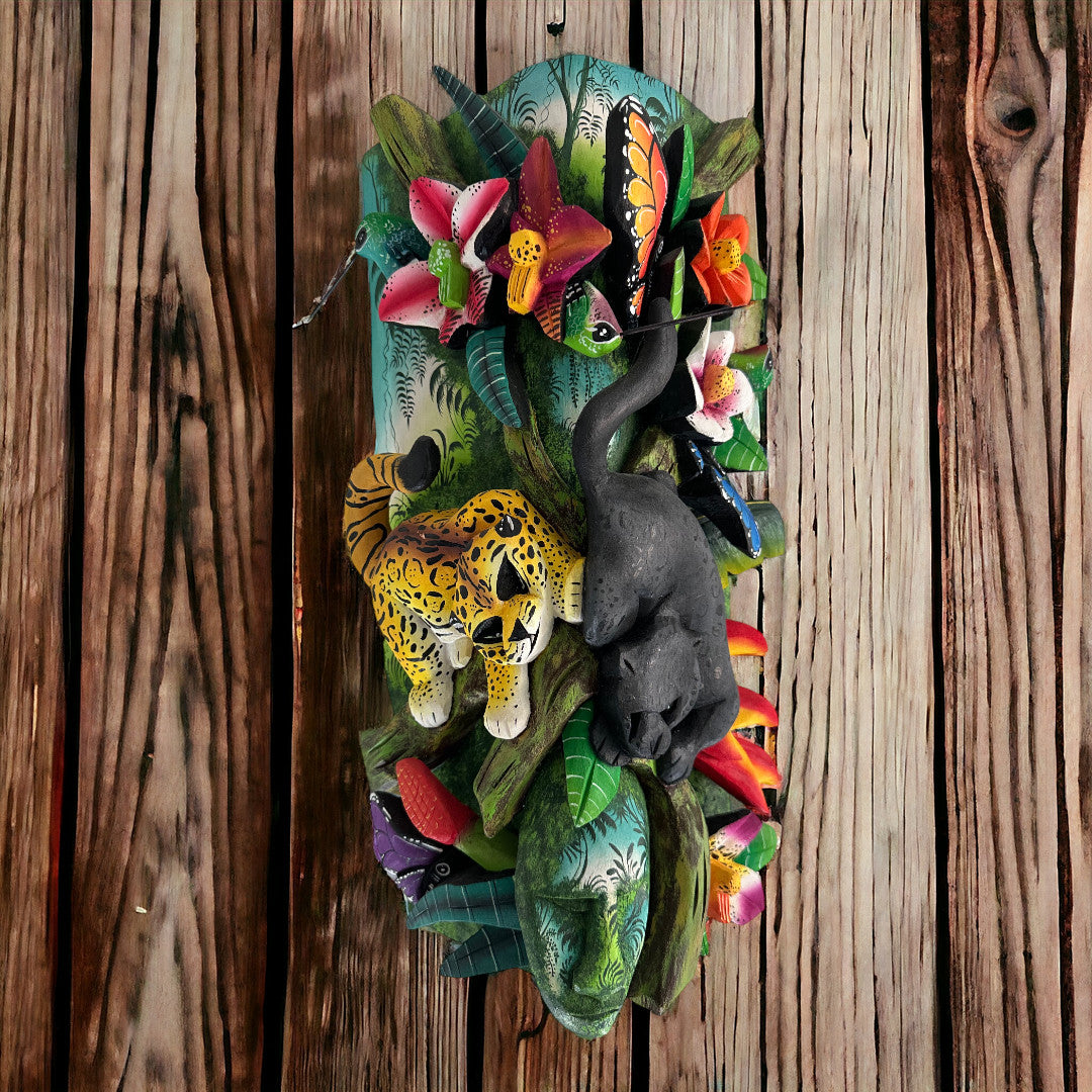Diese Maske zeigt die Begegnung eines Jaguars mit einem schwarzen Panther, umgeben von Kolibris, Schmetterlingen und tropischen Blüten. Ein Sinnbild für Kraft, Eleganz und Leben im Regenwald.