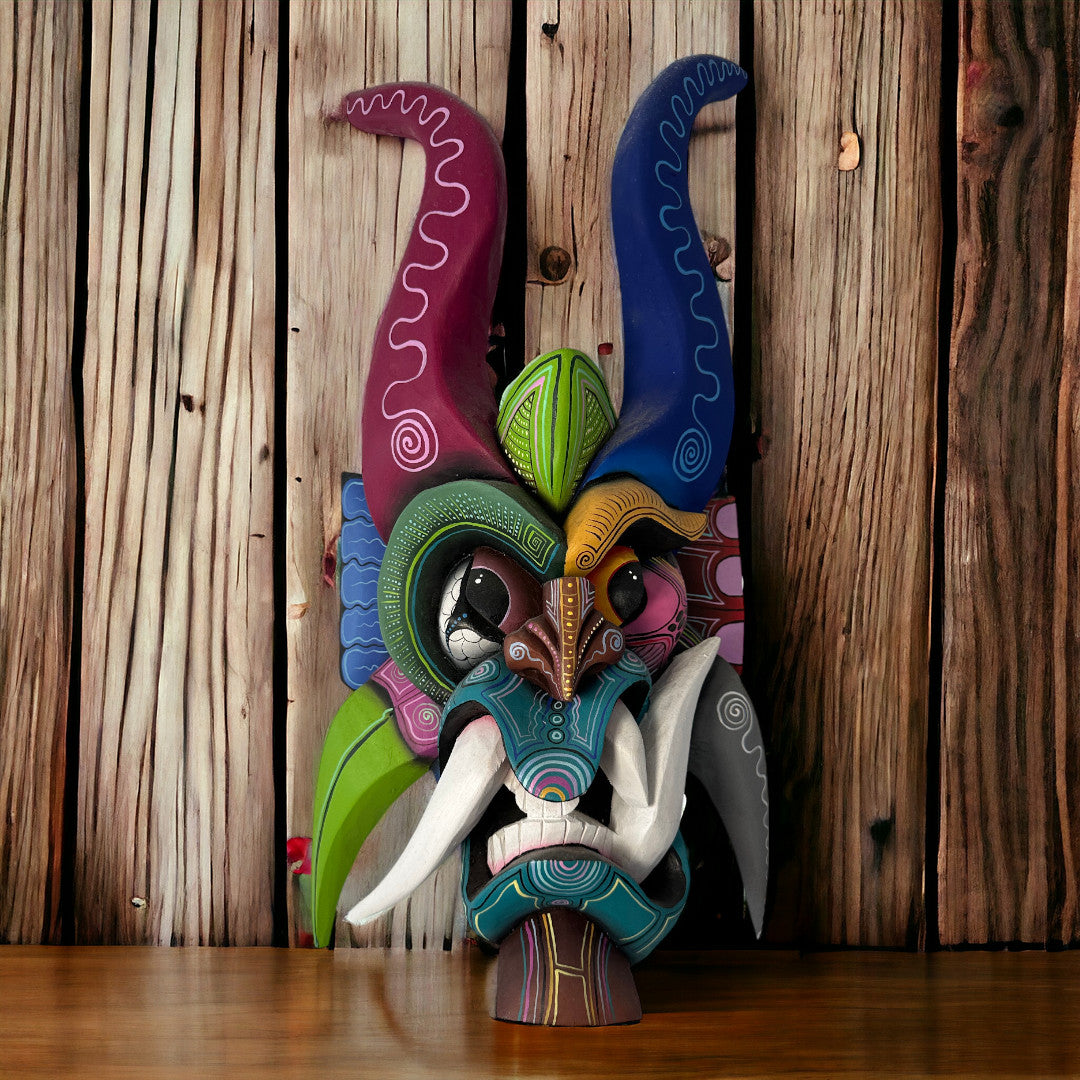 Diese eindrucksvolle Maske verkörpert einen kraftvollen Dschungelgeist mit zwei geschwungenen Hörnern – Symbol für Dualität, Balance und innere Stärke.