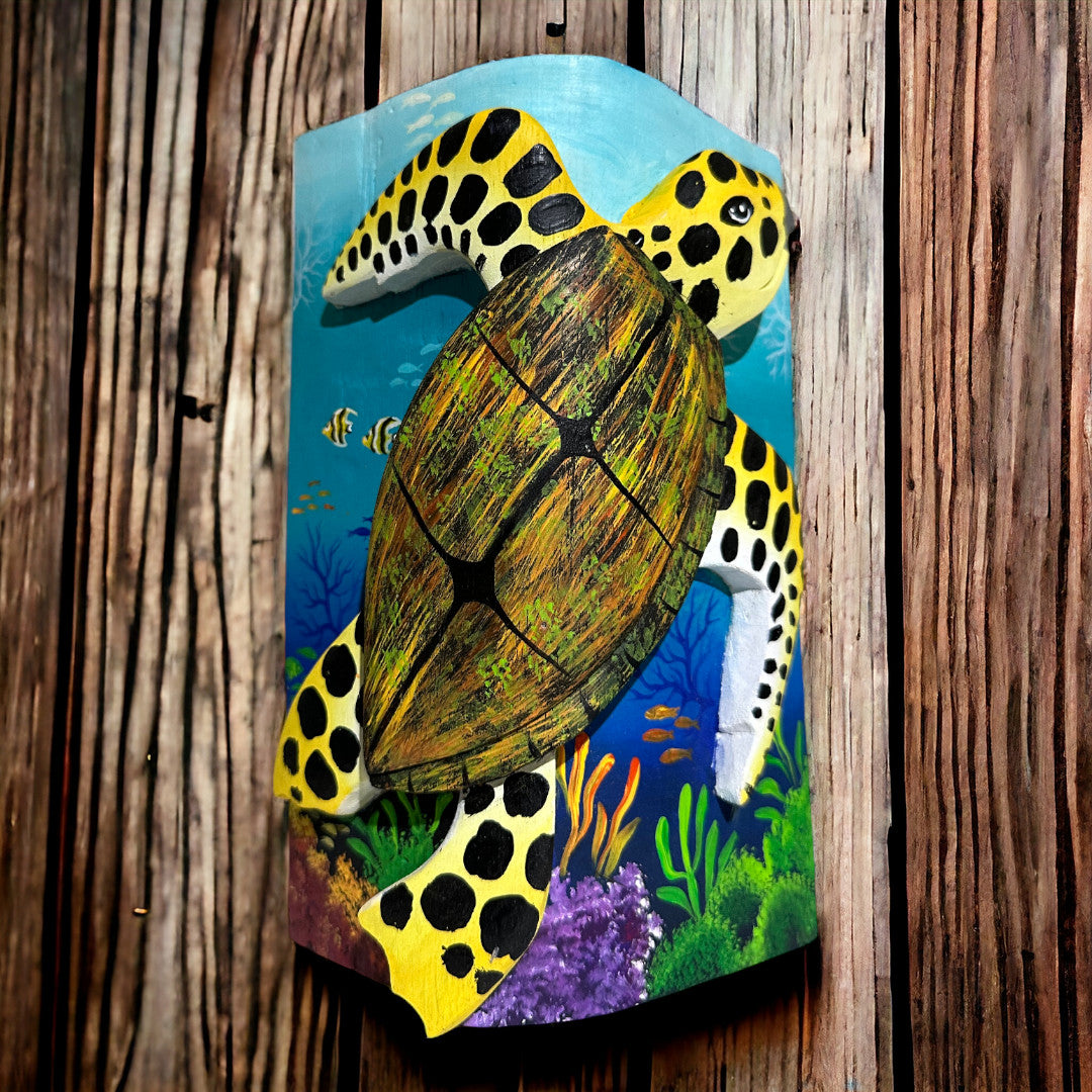 Diese handgeschnitzte Maske zeigt eine Meeresschildkröte im Korallenriff, umgeben von Fischen und Unterwasserpflanzen.