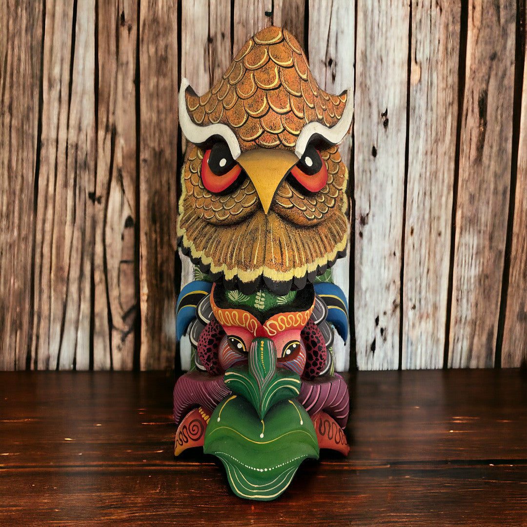 Diese Maske zeigt eine kraftvolle Eule als Symbol für Weisheit und Wachsamkeit. Darunter entfaltet sich ein stilisiertes Waldgesicht aus Blättern und Formen, das die Verbindung zwischen Natur und Geist darstellt.